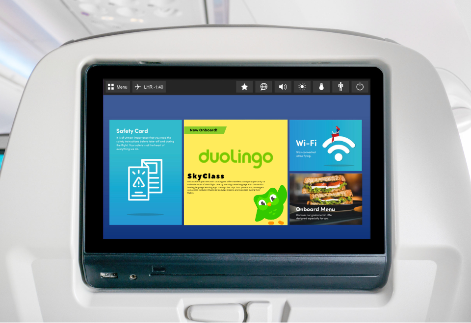 How about spicing up the plane with themed activities, movies, and language infographics in the seat pockets that direct them to Duolingo for a deeper language-learning experience?