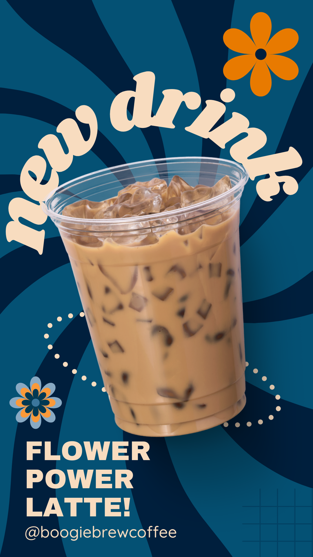 Create a brand identity and strong community presence for Boogie Brew, a coffee shop in a small city, inspired by the vibrant culture, music, and trends of the nostalgic 1970s.